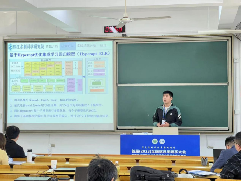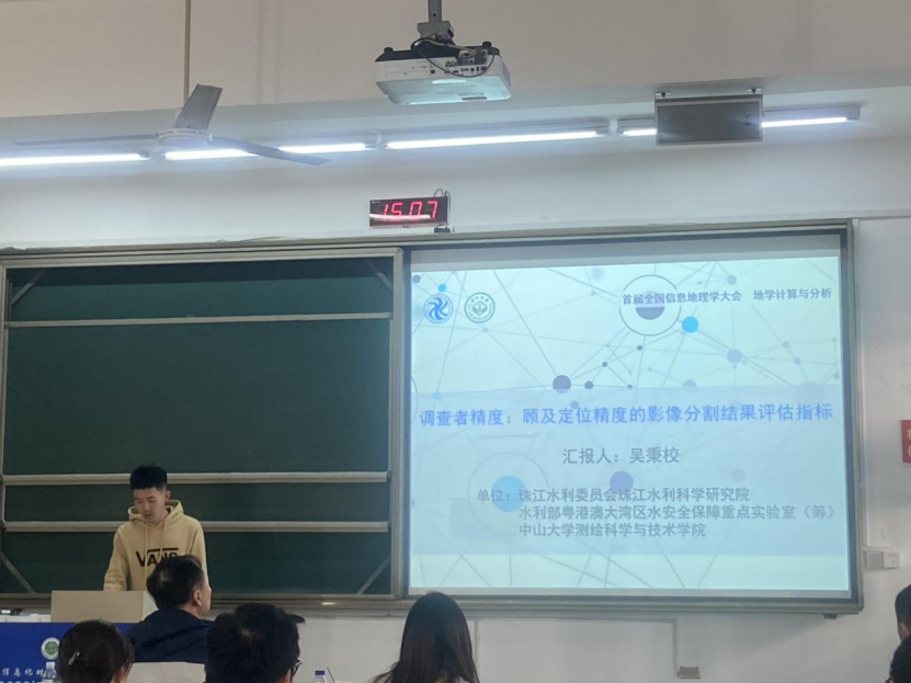 在此次会议中,共设立了7个论坛,包括信息地理学论坛、地理遥感科学论坛、地理信息科学论坛、地理数据科学论坛、青年论坛、信息地理学论坛及信息地理学与地学发展论坛,涵盖了51个专题。这些论坛不仅展示了地理学领域的最新进展,也为专家学者们提供了宝贵的交流机会。在AI与地理智能专题中,创新中心顾祝军教授作了题为《HydrSAI:一种水利遥感智能云平台》的报告。报告详细介绍了我们团队自主研发的AI遥感云服务平台HydrSAI,以及其样本库和模型库的构建方法。此外,报告还展示了利用该平台在人为扰动图斑、河湖岸线、河道碍洪物、河湖“四乱”和崩塌滑坡等应用场景的遥感智能识别结果以及团队在植被遥感和生态领域的相关研究成果。在地理计算与分析专题上,吴秉校博士介绍了其《顾及定位精度的影像分割结果评估指标》的研究成果。该指标通过栅格图斑分析其定位精度,有效避免了栅格矢量化过程中的分析误差,同时也无需对图斑中心像元与矢量化图斑的拓扑空间关系进行分析,从而提高了影像分割的准确性。植被遥感Ⅱ专题上,肖斌的报告《基于近端高光谱的柑橘LCC反演方法研究》也引起了广泛关注。该研究通过分数阶导数(FOD)和连续小波变换(CWT),明确了柑橘LCC的光谱响应特征,并确定了使用全光谱叶片原位高光谱数据估计LCC的敏感光谱范围。提出了一种基于Hyperopt优化的集成学习回归模型,评估了基于FOD和基于CWT的最优光谱特征变量之间LCC的估算能力。
