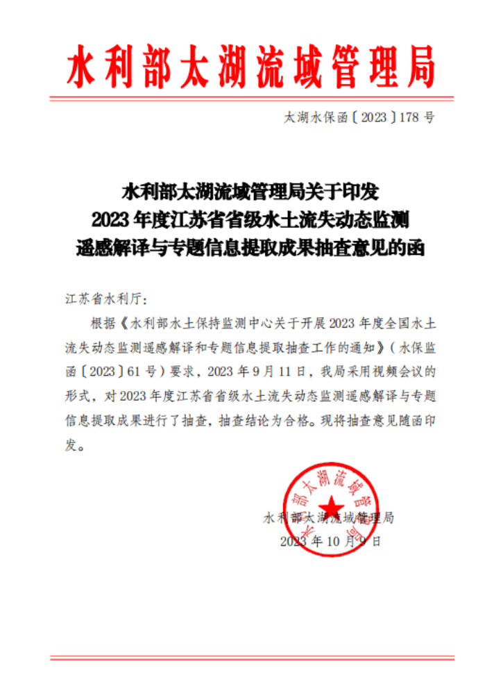 创新中心顺利通过江苏省2023年度水土流失动态监测项目解译成果抽查-2023-10-09遥感智能应用创新中心 根据《水利部水土保持监测中心关于开展 2023 年度全国水土流失动态监测遥感解译和专题信息提取抽查工作的通知》(水保监函〔2023〕61 号)要求,太湖流域管理局于2023 年 9 月 11 日采用视频会议的形式,对本科室承担的江苏省2023年度水土流失动态监测项目遥感解译与专题信息提取成果进行了抽查,抽查结论为合格。