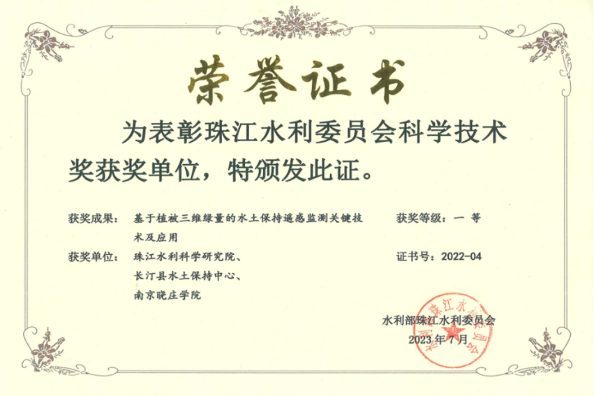 近年来,创新中心持续加强与长汀县的科技协作,积极探索和应用推广水土流失治理新模式、新技术,为长汀县水土保持高质量发展提供科技支撑。2023年7月,珠江水利科学研究院、长汀县水土保持中心与南京晓庄学院共同研究课题《基于植被三维绿量的水土保持遥感监测关键技术及应用》荣获水利部珠江委员会科技进步一等奖。