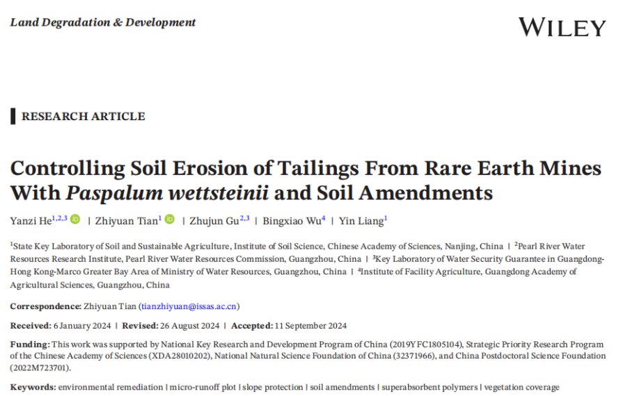 遥感智能应用创新中心 近日,贺燕子博士在SCI期刊Land Degradation & Development,就废弃稀土矿区水土保持与生态修复关键问题发表文章,题为“Controlling Soil Erosion of Tailings From Rare Earth Mines With Paspalum wettsteinii and Soil Amendments”(https://doi.org/10.1002/ ldr.5313)。
