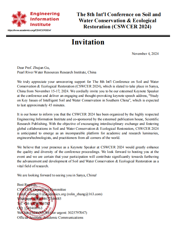 遥感智能应用创新中心 2024年11月16日,顾祝军教授应邀赴海南省三亚市参加第八届水土保持与生态修复国际研讨会(CSWCER 2024),并以“Study on Key Issues of Intelligent Water and Soil Conservation in Southern China”为题作英文主旨报告。
